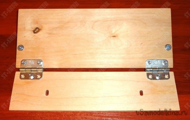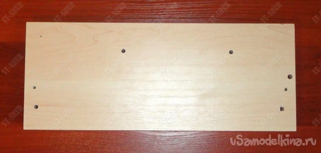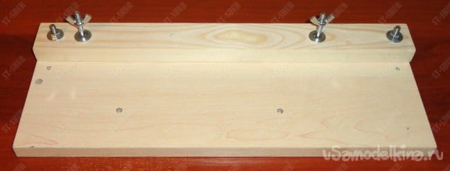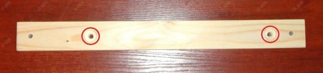 Для заглубления шляпок мебельных болтов с нижней стороны нижней планки сделаны выборки с помощью перьевого сверла диаметром 16мм. Просверлены крепежные отверстия под винты 6мм.