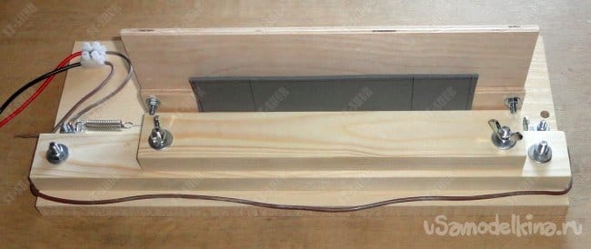 Конструкция получилась довольно удобная в использовании. В дальнейшем могут быть различные доработки. Возможно, деревянная верхняя планка зажима заготовки будет заменена на алюминиевый «Г» образный профиль. Хотя и деревянная рейка довольно хорошо выполняет свою задачу. В качестве блока питания отлично справляется БП, описание которого изложено в ранее опубликованной статье. БП подключается к приспособлению с помощью клеммной колодки.