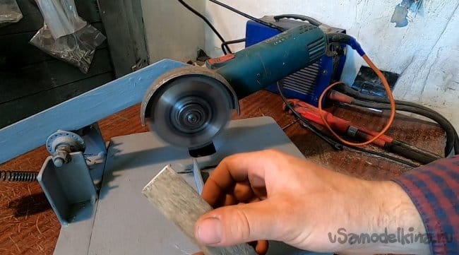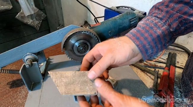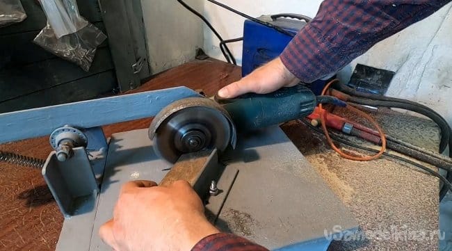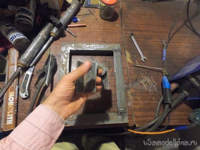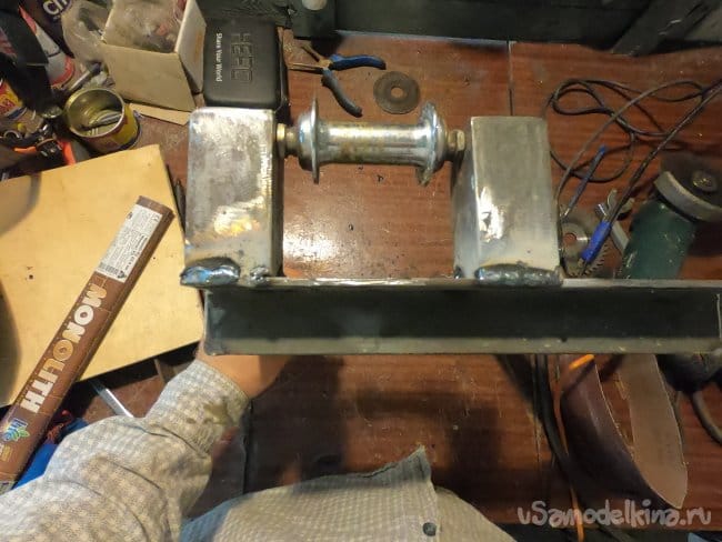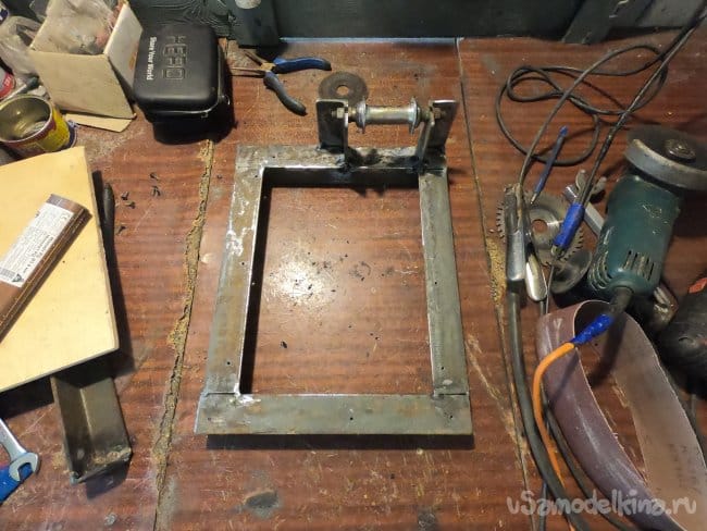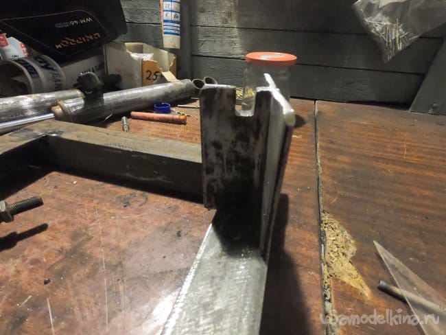 Сварил два уголка вместе, прошлифовал болгаркой, чтобы они были одинаковыми. В таком же состоянии пропилил пазы под ось. Ну а далее уголки осталось разъединить и приварить к основанию в правый угол. Вот и все, теперь можно прикрутить ось, не забыв убрать в ней люфт.