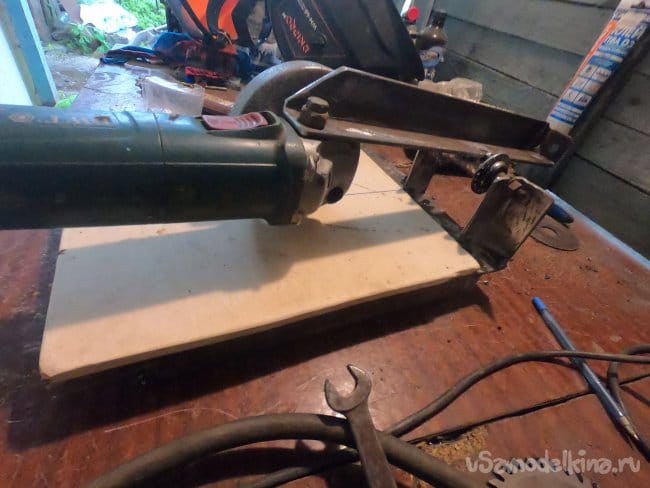Ну а далее, чтобы болгарка не весела только лишь на одном болте, в целях безопасности, приварил еще стальную пластину, выгнул в скобу и прорезал паз под второй крепежный болт.