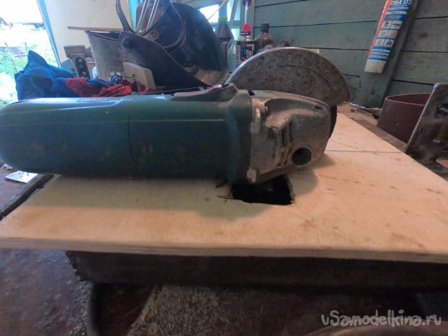 В качестве столешницы имелся лист фанеры, в раме просверлил отверстия и прикрутил фанеру короткими саморезами. Можно использовать и длинные, потом лишние концы можно срезать болгаркой.