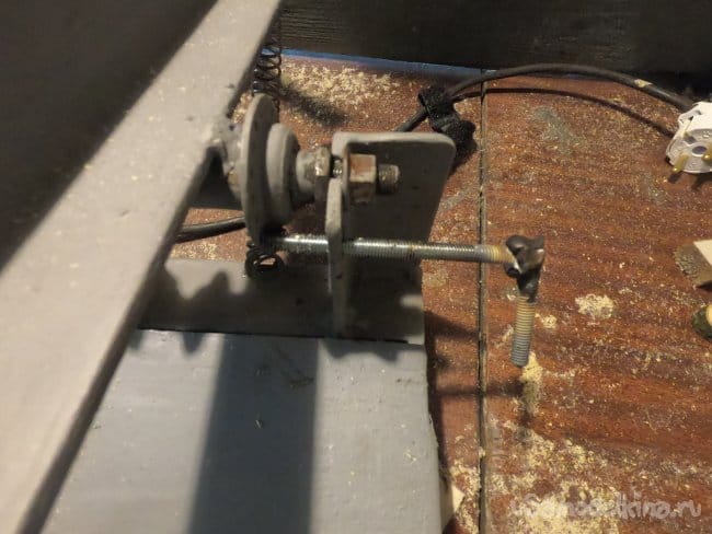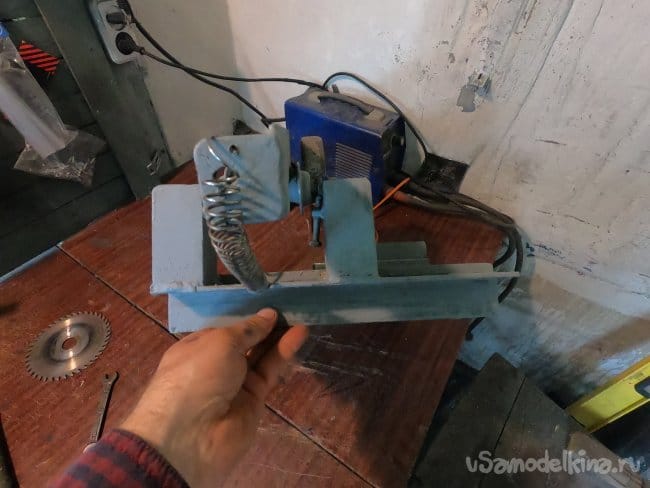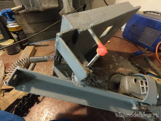 Под одной из сторон оси приварил гайку и завернул упорный болт. Нужен болт для установки угла оси, он позволит расположить отрезной диск перпендикулярно относительно столешницы.
