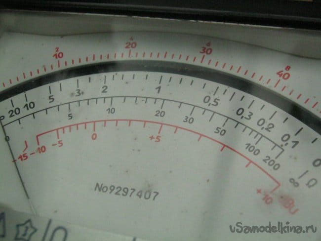 Фото 19. Омметр. Килоомы. При замыкании щупов стрелка отклоняется, ручкой переменного резистора (около кнопок прибора) выставляется на «0 кОм» по соответствующей шкале.