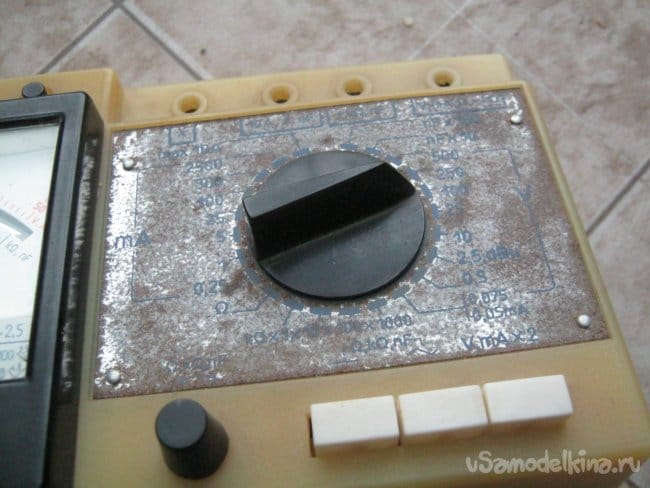 Ну и что мы имеем? Так-так. Пластик корпуса пожелтел, но это черт с ним, а вот хромирование-никелирование шильда под переключателем огорчило. Вид (Фото 3). Да и надписи, пока еще различимы, но видимо не надолго. Вариант ремонта – нетолстая латунная или медная пластинка, вычерчивание надписей в КАДе и перенос изображения фотоспособом, травление, искусственная патина. С этим пока подождем.