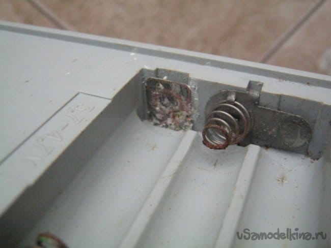 Под широкой крышкой с выдавленной схемой соединений – батарейный отсек (Фото 4). Контакты сильно окислены (Фото 5) – сделаны из неважного металла, да и батарейки были дрянь. Частенько протекал электролит, чудо что не попало внутрь прибора. Помнится еще тогда с ними намаялся, все время приходилось зачищать эти пружины.