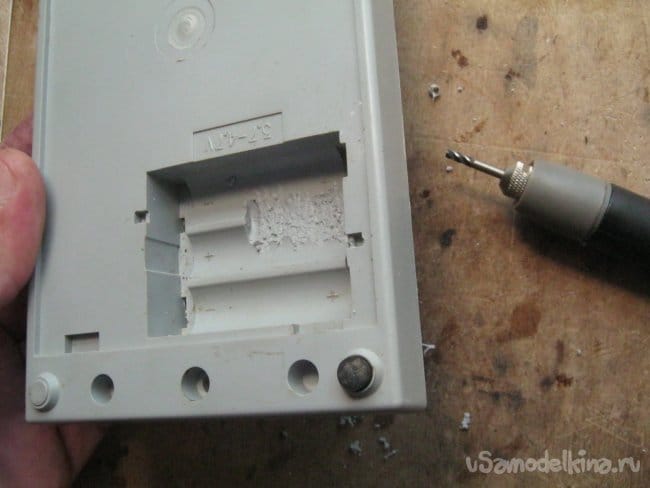 Приобретенный блок-контейнер для трех элементов ААА в батарейный отсек прибора чуть-чуть не вошел по высоте. Тонкой спиральной фрезой (можно работать торцом) зажатой в шпиндель гибкого вала бормашины отфрезеровал пластиковые волны, выровнял дно. Слегка прошелся и по боковым стенкам, для лучшего сцепления клея (Фото 14).