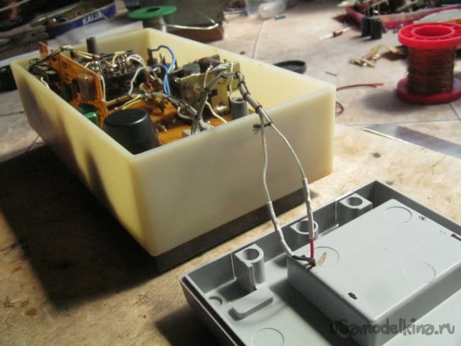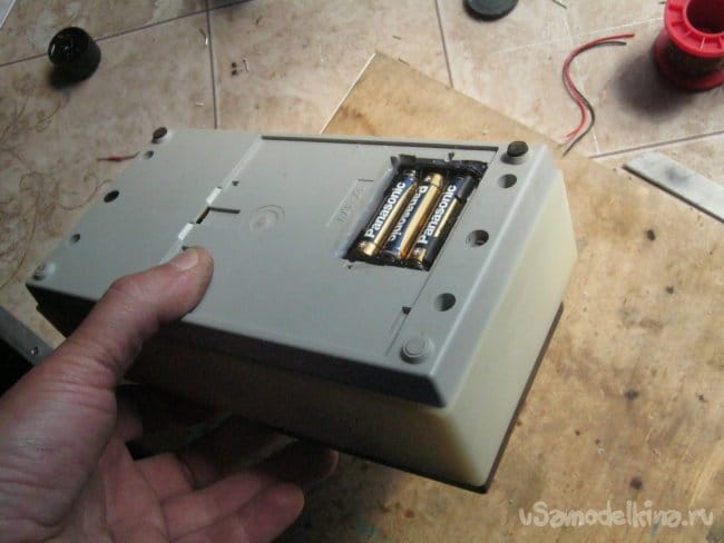 Острым ножом поскреб и наружные боковые стенки вклеиваемого контейнера, пропустил его провода в имеющиеся отверстия на дне прибора, вклеил термоклеем из пистолета, им же залил и образовавшиеся щели вокруг. После застывания клея укоротил и соединил провода нового батарейного отсека с проводкой прибора, изолировал места пайки термотрубками (Фото 15).