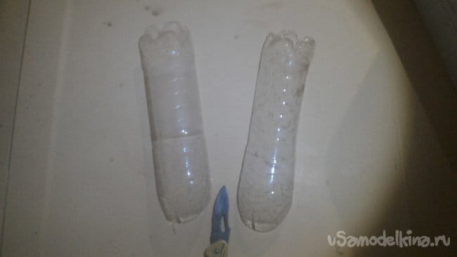 Пластиковую бутылку я разрезал ножом вдоль пополам от дна до горлышка.