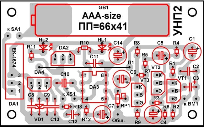 Если УНП2 при работе возбуждается: свистит или «затыкается», то следует проверить ёмкость С1 и убедиться, что экран на верхней стороне печатной платы соединен с общим проводом трассировки на нижней стороне платы).