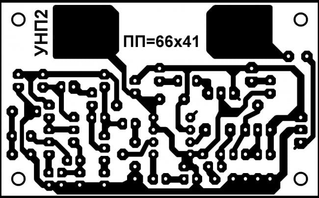 Печатная плата УНП2 (см. рисунки 2 и 3) выполнена из двухсторонне фольгированного стеклотекстолита размерами 60 х 41 х 2 мм.