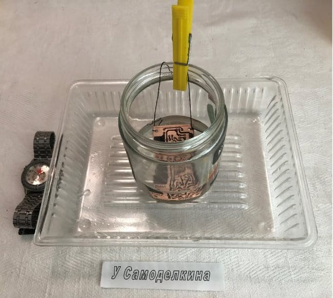Для ускорения травления рекомендуется раствор обдувать феном (перемешивать раствор). К ПП до травления привязывается суровая нить, за которую плату можно опускать и вынимать из раствора, не касаясь раствора руками.