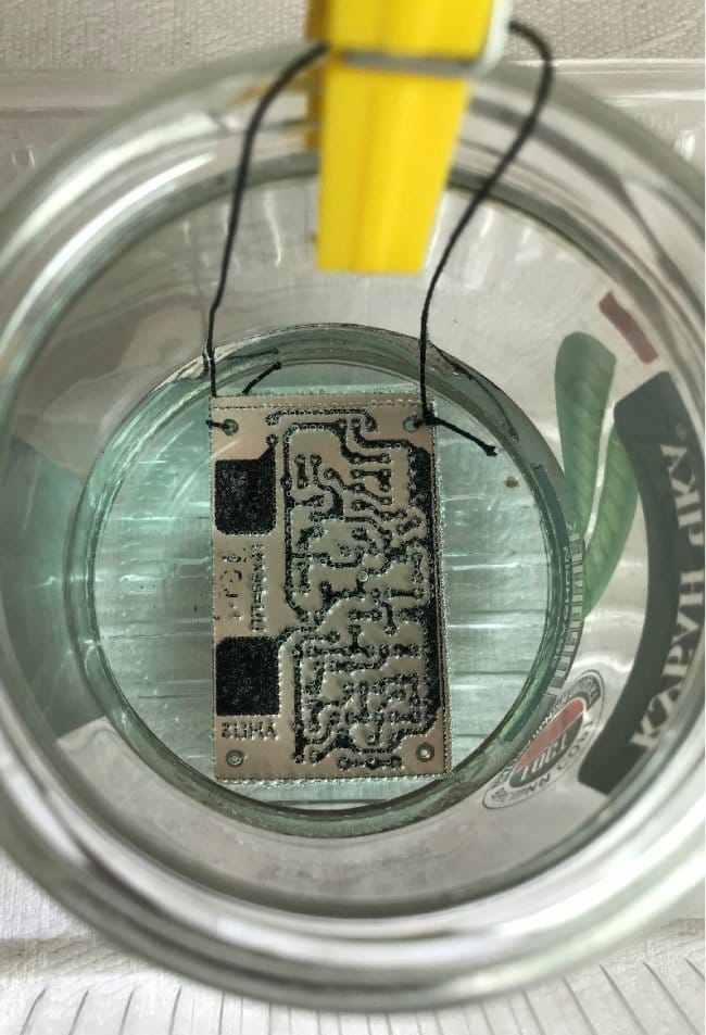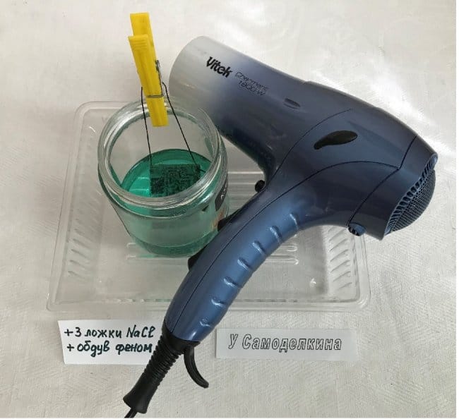 Для ускорения травления в раствор добавлены 5 г NaCl (поваренной соли), а феном в течение 30 минут создавалась волна в растворе. Процесс образования пузырьков при этом ускорялся. В процессе травления прозрачный раствор начал зеленеть.
