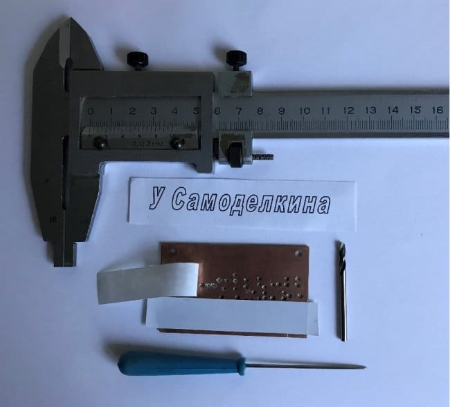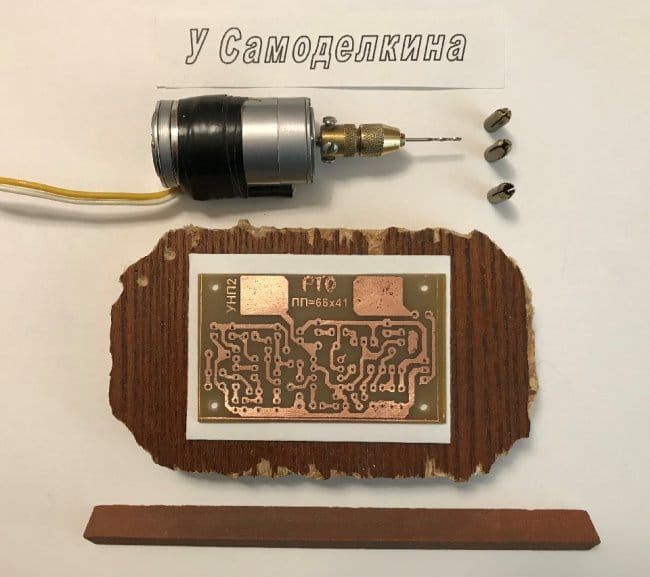 Протравленная плата промыта в воде. Защитный тонер снят методом соскабливания. Остатки тонера сняты мелкой шкуркой. Для сверления отверстий в ПП использовалась самодельная ручная мини дрель со сменными цангами. Заточка сверла выполнялась через 50 просверленных отверстий на смоченном в воде бруске.