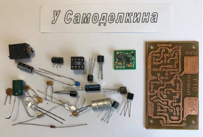 В УНП2 можно применить постоянные резисторы МЛТ, С2-23 или С2-33. Подстроечный RP1 – СП3-38а или потенциометр СП4-1. Конденсаторы С2, С5, С6, С8, С9, С11 … С13 керамические миниатюрные зарубежного производства или типа К10-17, КМ. Остальные – оксидные типа К50-35 или зарубежного производства. Диод VD1 типа КД503, КД510, КД520 … КД522 с любым буквенным индексом. Транзисторы VT1 … VT3 - биполярные структуры n-p-n – желательно малошумящие, типа КТ3102Д, КТ3102Е с коэффициентом усиления по напряжению (К у U) порядка 500. Их можно заменить зарубежными 2N2484. ИМС DA2 КР1171СП42 можно заменить любой из ряда ИМС от КР1171СП36 (с U пороговым = +3,6 В) до КР1171СП47 (с U пороговым = + 4,7 В). ИМС DA3 TDA2822M имеет отечественный аналог К174УН22, и зарубежные аналоги: К2209 (фирмы «Samsung»), NJM2073 (фирмы «New Japan Radio»). Интегральный стабилизатор DA4 – 1158ЕН3А (К1158ЕН3А) или подобный. В крайнем случае, используют 78L33 с большим в два раза (3 мА) током потребления и выходным напряжением +3,3 В. Тумблер SA1 - малогабаритный МТS-102 или особо малогабаритный SМТS-102. Гнездо XS1 типа СНЦ-3,5 с крепёжной гайкой или аналогичное для головных телефонов. GB1 – 1 аккумулятор типоразмера AAA-size. В авторском экземпляре применён аккумулятор «Panasonic» (made in China) HHR-55AAAB 1,2V ёмкостью 550 мА/час. Однако для увеличения времени непрерывной работы до очередного заряда аккумулятора, рекомендуется использовать аккумулятор ёмкостью 1000 … 1100 мА/час.
