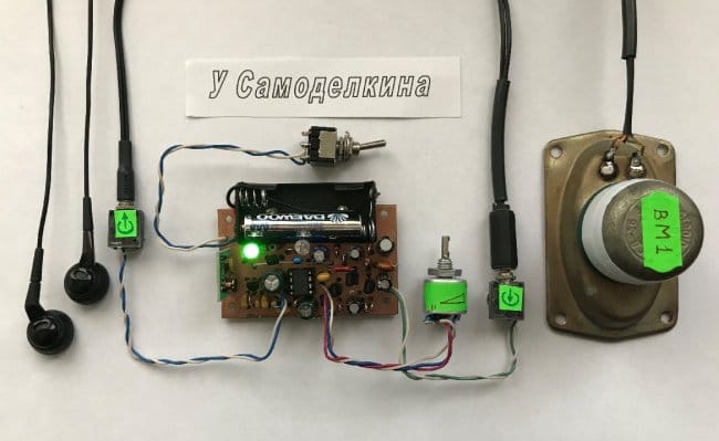 Микрофон BM1 соединяется с платой экранированным проводом. Для значительного ослабления ВЧ - помех от БРЭА, сотовых телефонов и т.п., наводимых на кабель, микрофон BM1 шунтируется керамическим конденсатором ёмкостью 220 ... 1500 пФ и даже до 1 мкФ включительно. Длина двухпроводного кабеля, ведущего от платы к гнезду BF1 в авторском варианте составляет 4 метра.