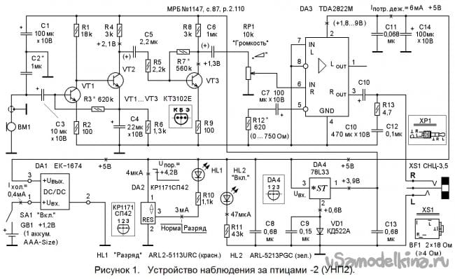 Известно, что из-за голода за зиму по некоторым данным погибают до 80% синиц и чуть меньшее количество воробьёв. Основной причиной гибели птиц зимой являются (как ни странно) не сильные морозы, а недостаток корма. Многие любители природы, зная это, подкармливают птиц зимой. Это позволяет не только поддержать численность воробьёв, синиц, поползней и других птиц, но и получить огромное эстетическое удовольствие, наблюдая за их поведением. Обычно птицы обедают на кормушке, а за окном на почтительном (чтобы не стеснять птиц) расстоянии, или вплотную к окну иногда стоит их «благодетель» и наблюдает за ними. Синицы, например, убедившись, что на этой кормушке им ничто не грозит, позволяют фотографировать себя даже с близкого расстояния. Получаются хорошие фотоснимки, а вот что касается звуковой картины, разворачивающейся на кормушке, то большая часть аудио информации до наблюдателя не доходит. Снять эту проблему можно, изготовив миниатюрное УНП2 (Устройство наблюдения за птицами-2).