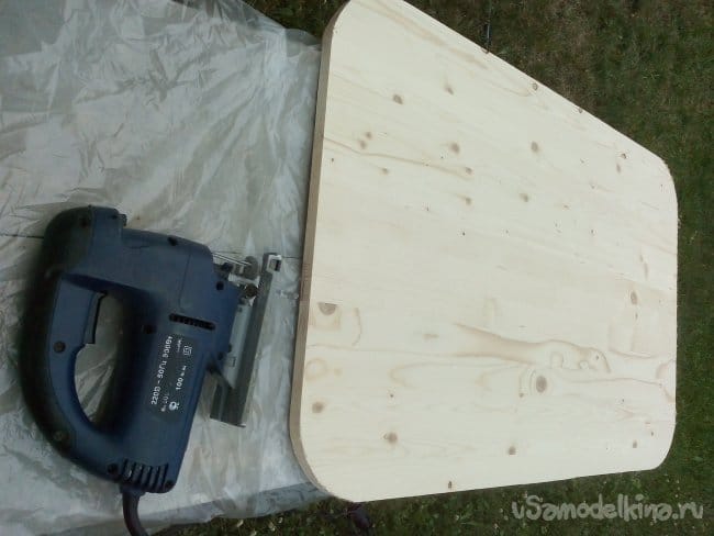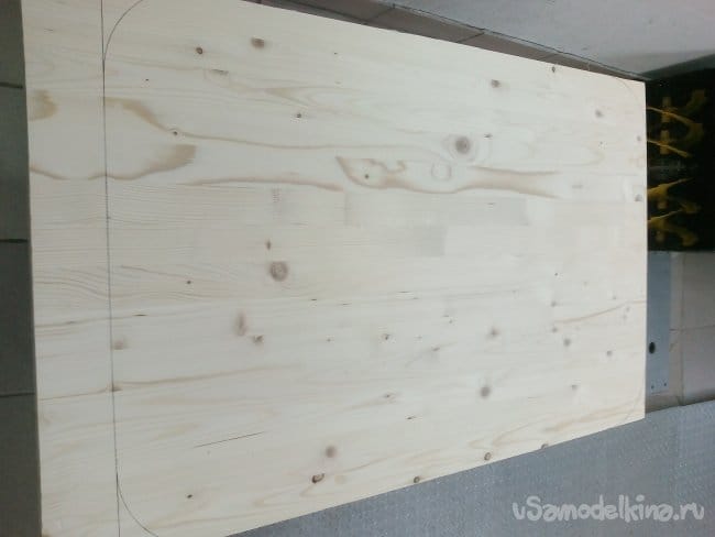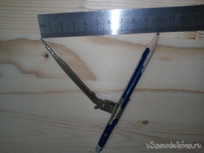 Выставил радиус в 100 мм., на циркуле «Козья ножка» и разметил дугами, отпиливаемые углы столешни.