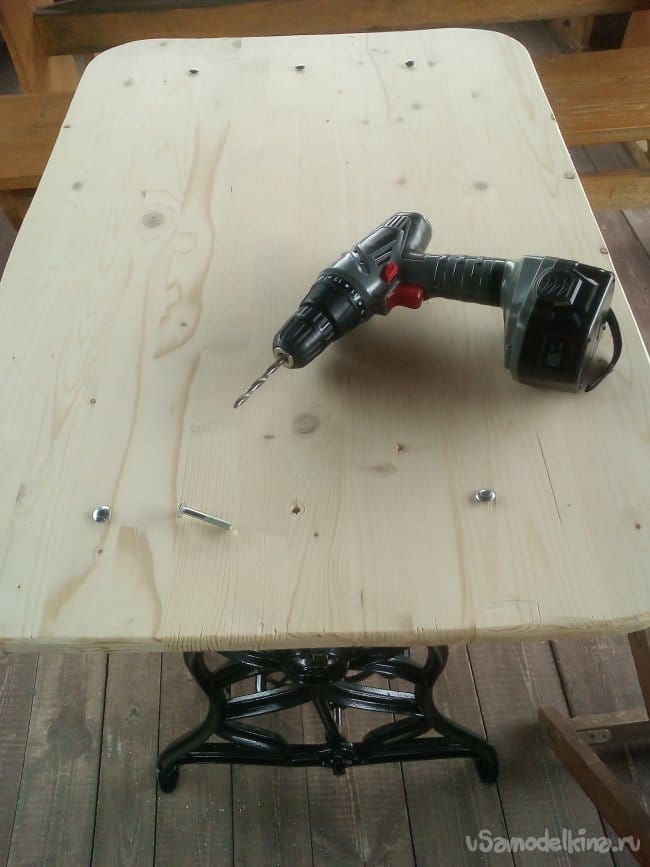 Выравниваем расположение столешни на станине и по месту сверлим установочные отверстия.