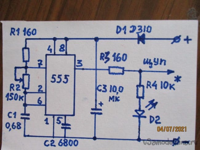 Теперь о проблеме. При наступлении отрицательных температур неожиданно переставал работать спидометр, а при положительных температурах воздуха – всё нормально. Стрелка на нуле, как ездить по городу? Кто виноват, спидометр или датчик? Пришлось изготовить прибор для проверки оного. Схема классическая, для микросхем 555 серии (таймер), привожу. СССР, содрав и выпустив свою версию 555 таймера под названием КР1006ВИ1, КР1008ВИ1 являются исключением, а все остальные фирмы мира выпускают их с цифрой 555, например, NE555. И, не смотря на стоящие впереди и позади буквы, цоколёвка всех таймеров совпадает и они взаимозаменяемые, в том числе и СССРовская 1006ВИ1, которую я и применил. Выходной ток до 300 мА (0.3 А), напряжение питания – от 3 до 16 В.