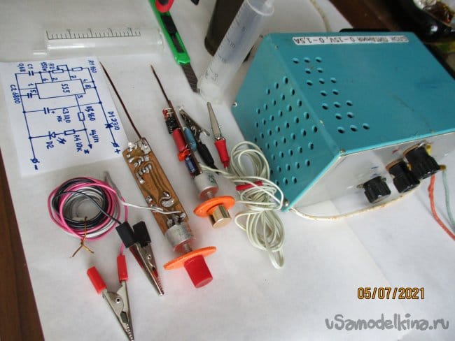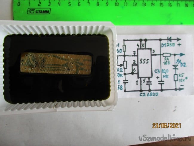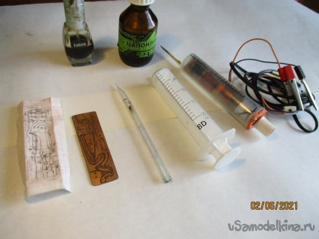 Как видно из фотографий, на таймере собран простейший генератор импульсов с частотой примерно 3 Герца – 1КГц,, при использовании деталей, указанных на схеме, и собранный в корпусе шприца на 20 мл. Для этого, вначале, вырезал кусочек фольгинированого стеклотекстолита размерами 20 х70 мм, который, с небольшим трением, входит внутрь корпуса шприца. Затем, обернув плату миллиметровой бумагой, расположил детали и нарисовал карандашом соединения. Накернил, снял миллиметровку, просверлил отверстия сверлом ф 0,8 мм, зачистил мелкой наждачной бумагой (нулёвкой) и, стеклянным рейсфедером, с помощью цапон – лака, перенёс рисунок с миллиметровки на плату. Отредактировал рисунок скальпелем и отправил плавать в раствор хлорного железа для травления. На фото видно, как идёт травление в ванночке с хлорным железом. Кстати, в купленной бутылочке цапон – лак оказался слишком бледным, пришлось добавить (выдуть) пасту из стержня шариковой ручки для повышения контрастности. Если цапон – лак слишком густой, можно разбавить ацетоном.