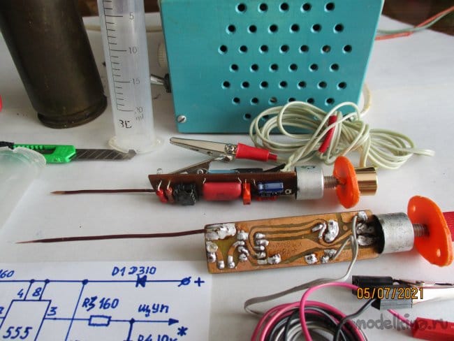 Места в шприце хватает, поэтому специально применил резисторы МЛТ 0,5, как наиболее распространённые, хотя мог впаять и помельче (МЛТ 0,25; 0,125). Диод D1 с прямым током не менее 300 мА, (можно любой силовой, например, КД102, КД105 и др.) и конденсатор С3 – это обычная защита «от дурака», когда перепутаны плюс и минус, их можно не ставить. Детали можно припаивать как сверху, так и снизу платы, чем я и воспользовался. В первом экземпляре установил конденсатор С1 0,68мк., а во втором – 2 х 0,33мк., один сверху, а второй внизу платы. Ставил конденсатор С1 1мк. – не понравилось, слишком большой сдвиг в сторону низких частот. Переменный резистор типа СП2-2-0,5; СП3-9а; СП-04; СПО-0,5 и другие, имеющие одинаковые габариты, от 100 до 500 КОм. Светодиод любой, надо только подобрать резистор R5 по желаемой яркости свечения светодиода при напряжении 12 -14 В. Микросхема КР1006ВИ1 установлена на панельку. У меня было несколько, выпаянных из старых плат, микросхем 1995г. выпуска, и, меняя их по очереди на панельке, убедился, что все они работают! Выходной щуп – это отрезок ф 1,5 мм медного провода, как раз по диаметру выходного отверстия шприца. Для подключения прибора к аккумулятору автомобиля, на концах проводов припаял зажимы типа «крокодил», чёрный – (-), красный – (+). Как изготавливать плату я описывал и в материале «Изготовление регулятора температуры жала паяльника». В наладке прибор не нуждается, разброс номиналов деталей – ±20%.