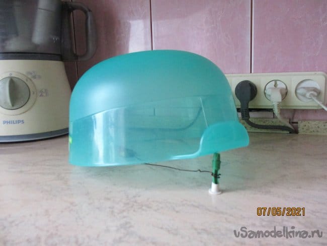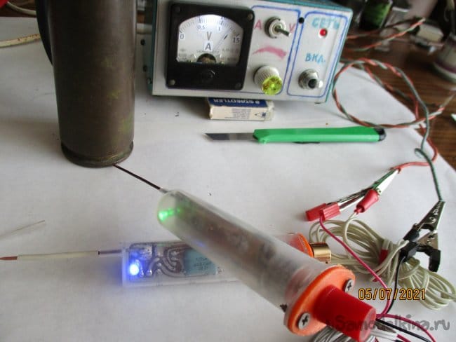 2. Подключил к аккумулятору с помощью «крокодилов» прибор, внутри шприца замигал светодиод.