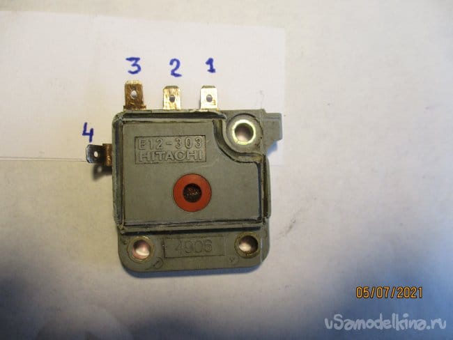 6. Коснуться щупом прибора вывода 1 коммутатора. Должна замигать лампочка в такт мигания светодиода. Если нет – неисправен коммутатор. Таким образом можно проверить ЛЮБЫЕ коммутаторы на ЛЮБЫХ машинах, зная подключение выводов коммутатора. При этом, меняя частоту импульсов ручкой на корпусе прибора, можно увидеть, как, якобы, меняются обороты двигателя на тахометре приборного щитка в кабине автомобиля, что лишний раз указывает на исправность коммутатора. Провод на тахометр выходит от 4 вывода коммутатора.