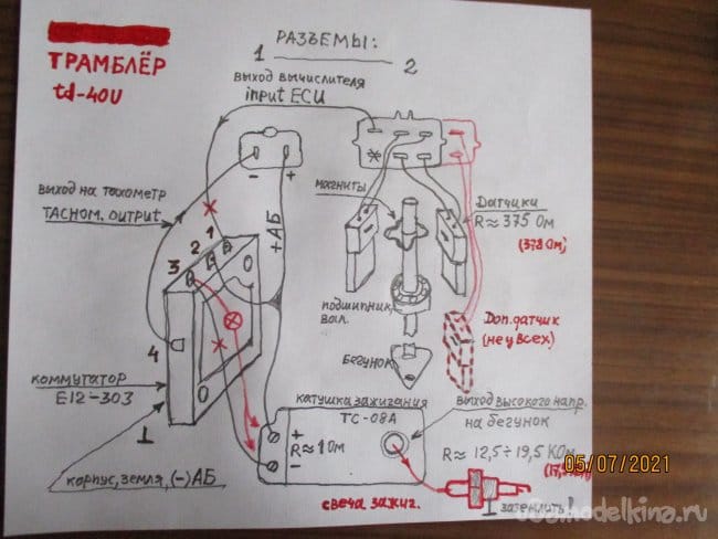 Определить неисправность в трамблёре можно и не снимая его с машины. Эскиз устройства трамблёра привожу, выводы коммутатора обозначил условно.