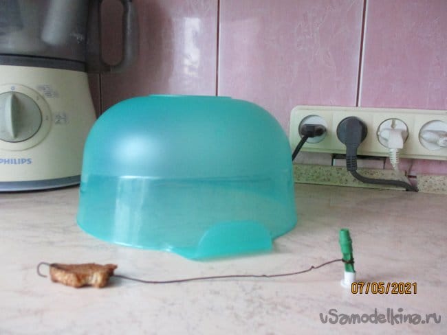 Мышеловки нет, пришлось импровизировать. Для этого взял глубокую пластмассовую тарелку – миску, какую-то палочку от детской игрушки и прикрепил к ней кусочек ЖЁСТКОЙ проволоки (медной). Как утверждают британские учёные, (цитирую телеканал «Наука»), мышки сыр не едят, не любят, в природе его нет, поэтому оснастил кусочком поджаренного хлеба. Подпёр палочкой тарелку и оставил на ночь. Утром мышка была внутри тарелки. Взял ведро, подставил к столешнице, сдвинул тарелку с мышкой – она сама спрыгнула в ведро, прыгает, но выскочить не может. Маленькая, серенькая, симпатичная, напуганная, жалко. Что делать?