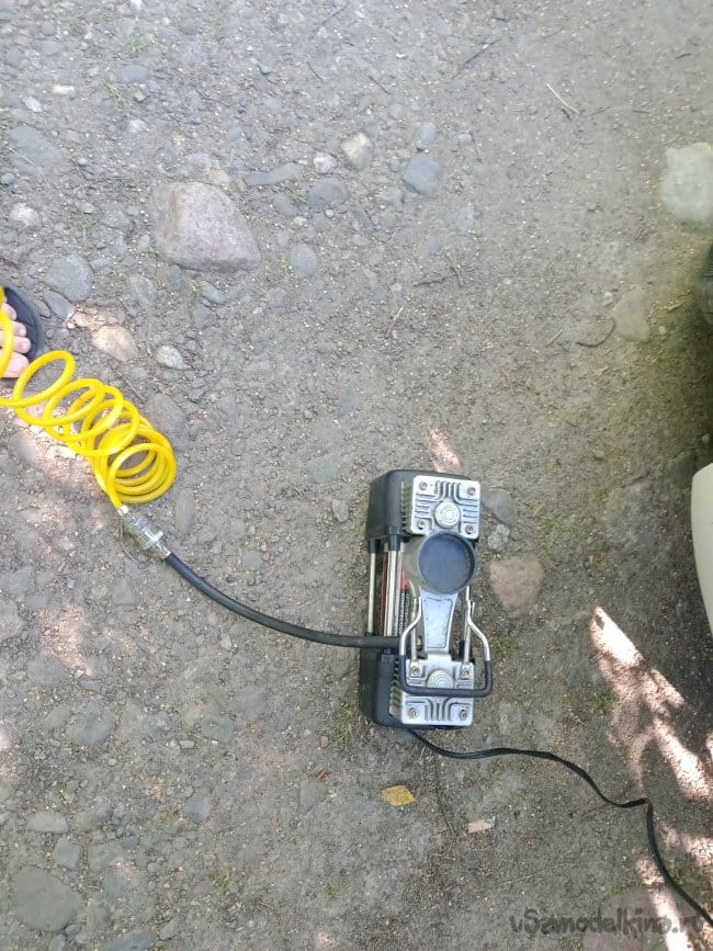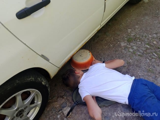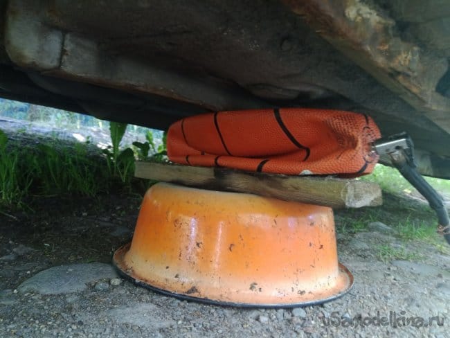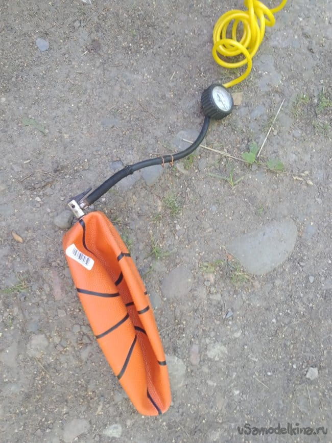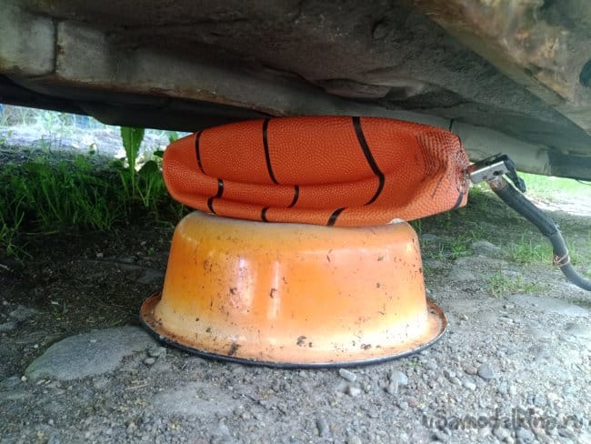 Доброго всем дня, мой мозг всё время ищет что-нибудь эдакое. В данном случае из-за того, что у моей машины гнилые пороги, обычный домкрат пристроить сложно, и я решил попробовать в очередной раз поддомкратить машину надувающимся баскетбольным мячом. Получилось не очень. Толщина сдутого мяча 5 см, а надутого 25, и это самый большой баскетбольный мяч, 7 размер. Итого 20 см высота поднятия. Оказалось маловато. Зато мы узнали предельное давление, которое выдерживает этот мяч, 4 Бара. Точнее, при 4 он взрывается. Это попытка номер 7. В качестве упоров две сковородки, между ними мяч. Для уменьшения стартовой высоты сначала взяли кирпич, а потом деревяху, она больше подходила по высоте. После этой попытки даже не знаю, в каком направлении дальше двигаться. Или остановиться уже? Мяч со сковородками вполне могли выстрелить и в меня. На первых снимках миска, её смяло при испытаниях, пришлось заменить на кирпич, а потом на доску. Компрессор мощный, поэтому его подключали напрямую к АКБ. Дальше понятно, к насосу иглу для накачки, иглу в мяч, и поехали. Футбольный мяч был заменён на баскетбольный.