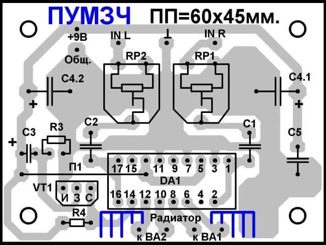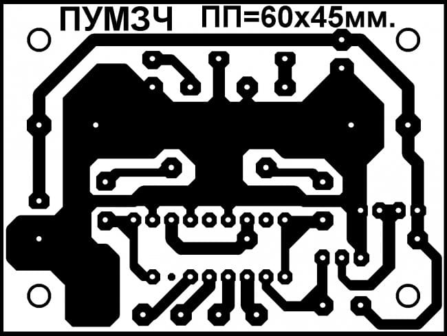 Печатная плата усилителя выполнена из одностороннего фольгированного стеклотекстолита размерами 60х45х2 мм (см. рисунок 2).