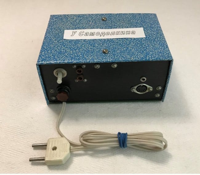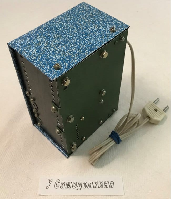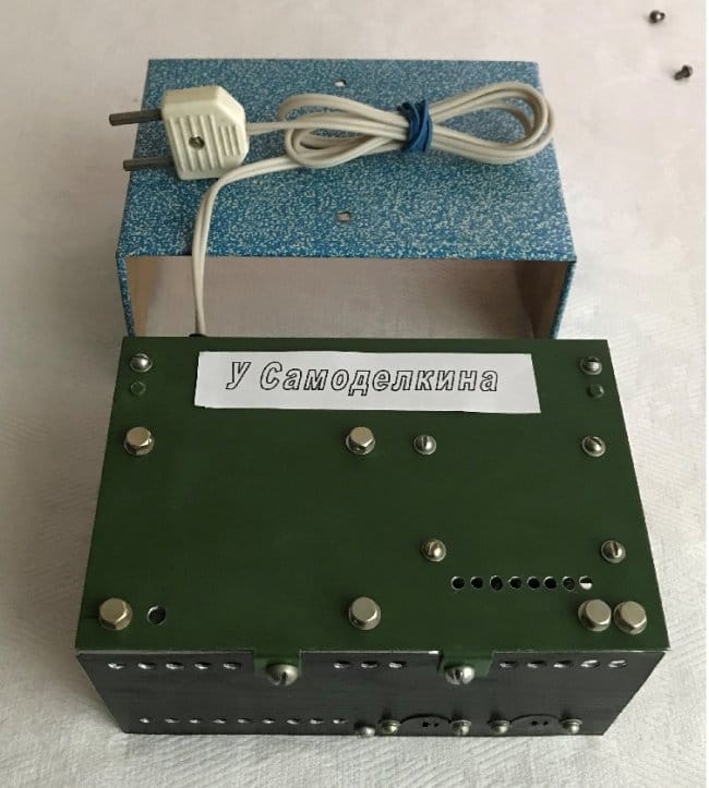 Внешний вид на детали ПУМЗЧ сверху изображён на рисунке 10. В верхнюю крышку корпуса (с внутренней стороны) вжат лист из электрокартона, исключающий контакт с РЭК, установленными внутри корпуса. Шнур электропитания, при отсутствии необходимости его использования на всю длину, аккуратно складывается и стягивается аптечной резинкой.