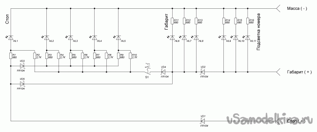 При включенном габарите загораются как и в предыдущем случае диоды ГАБАРИТА HL6-HL8 и диоды ПОДСВЕТКИ НОМЕРА + диоды стопа HL1-HL5 с заниженной яркостью через диод VD4, через замкнутые контакты кнопки S1 и резисторы R2,R4,R6,R8,R10. Имитация габарита(весь фонарь светится тускло) как при двухнитевой лампе накаливания.