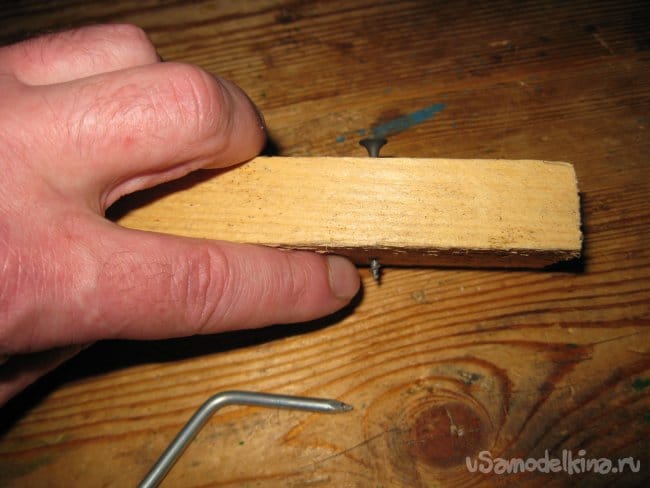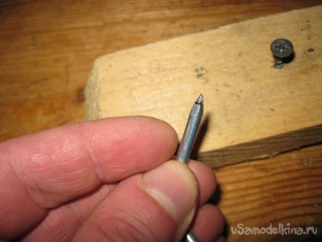 Теперь втыкаем шуруп в дощечку (ее толщина 2 см.), вставляем в его шлиц острый кончик гвоздя и начинаем закручивать шуруп.