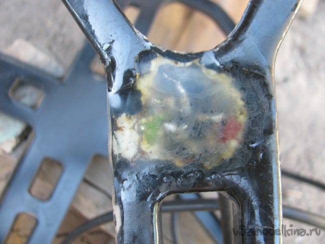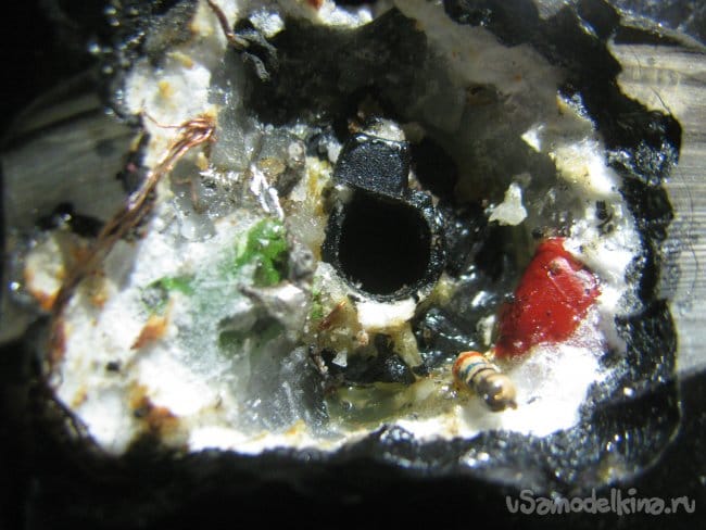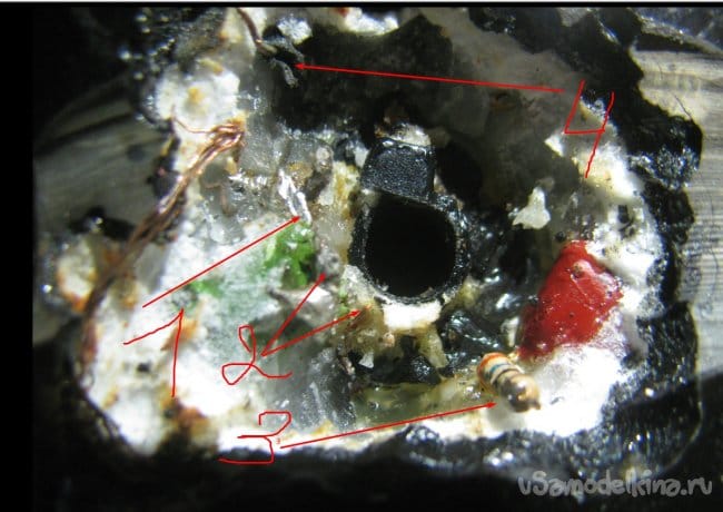 С обратной стороны напротив входа разогрел заливку термофеном, она становится мягкой, как желе, все это дело легко расковыривается маленькой отверточкой. Самое главное тут, не повредить конденсаторы, резистор и записать, куда что подключено!