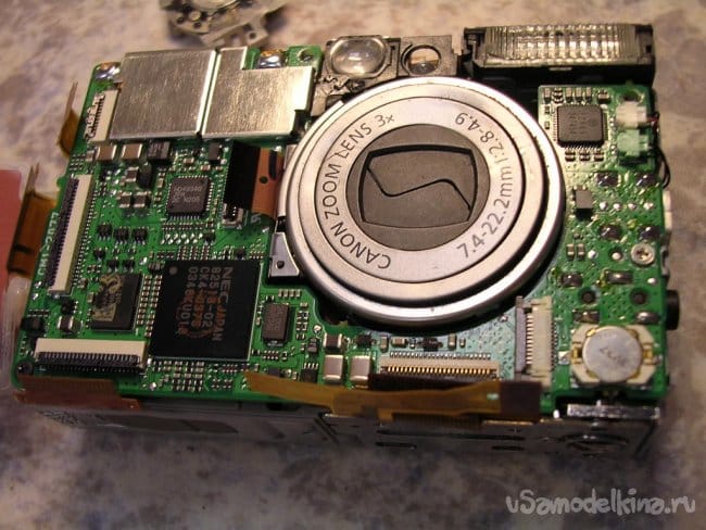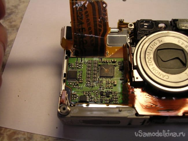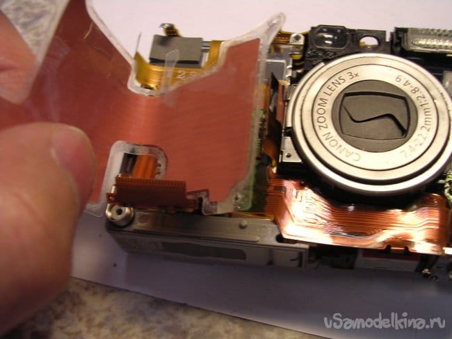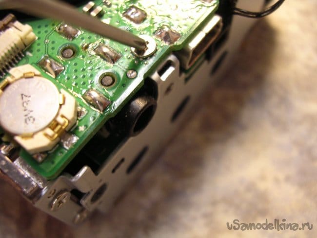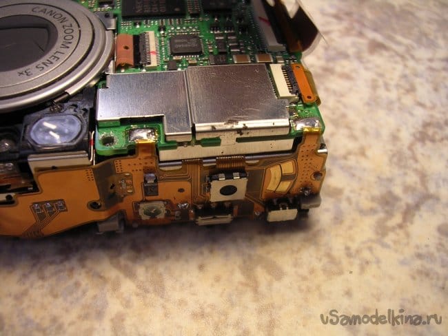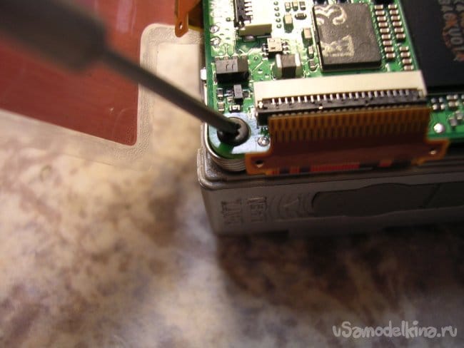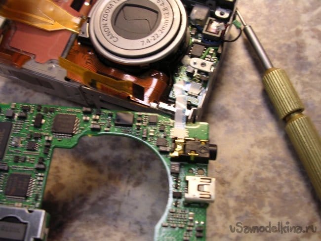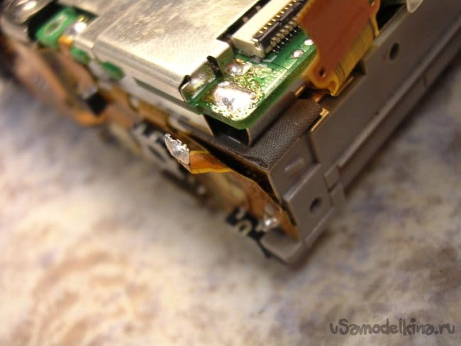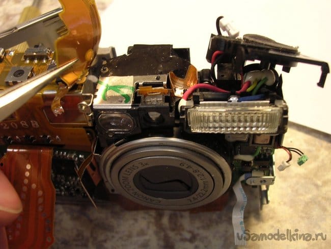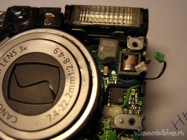 Разъемы на плату вспышки и продолжаю разборку. Конденсатор упрятан достаточно глубоко. Поэтому работаю максимально аккуратно.