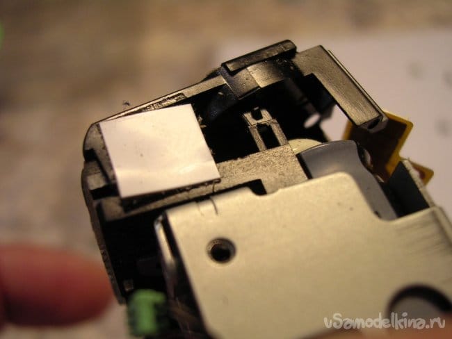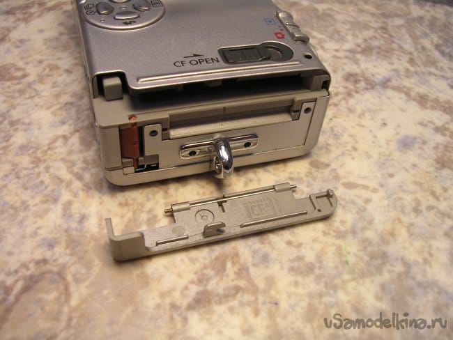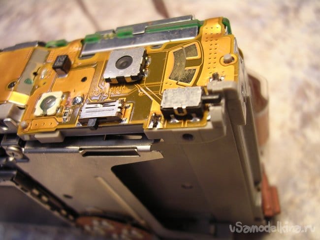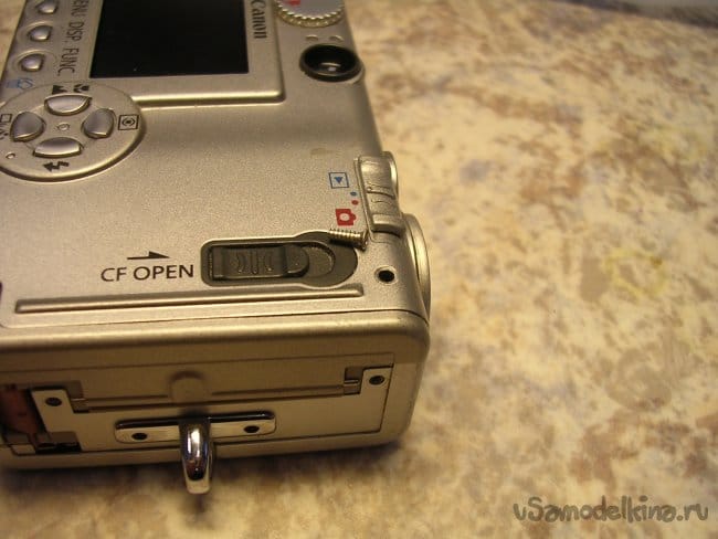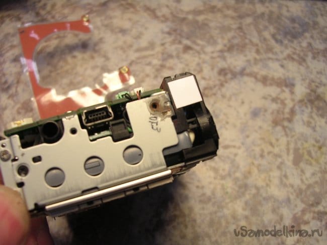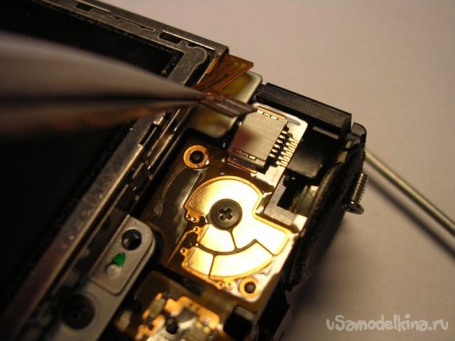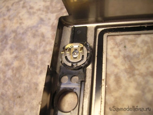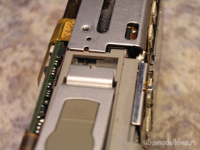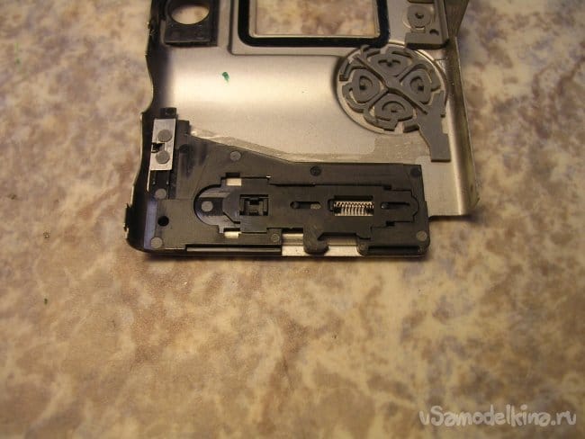 По краю торчит контакт закрытия крышки карты памяти, осторожно не сломать.
