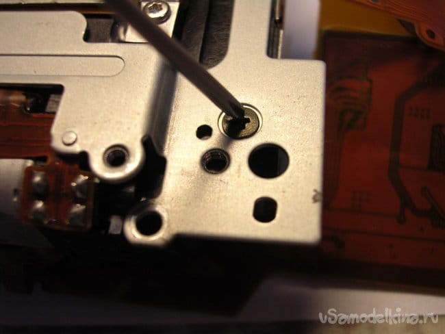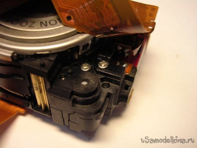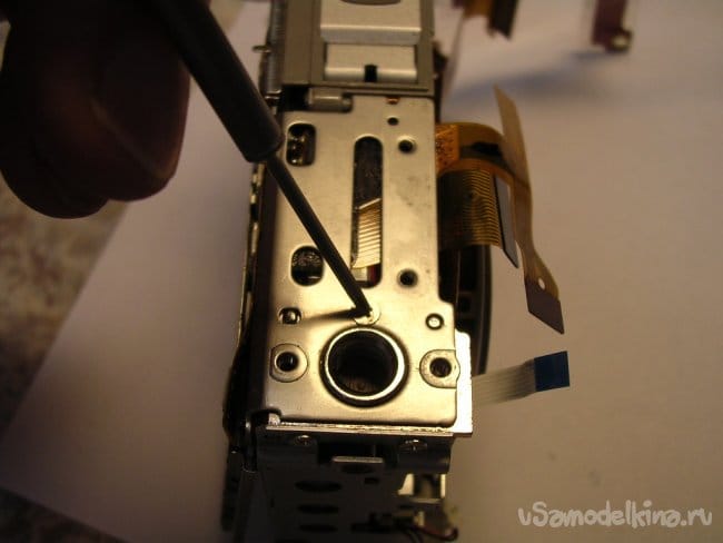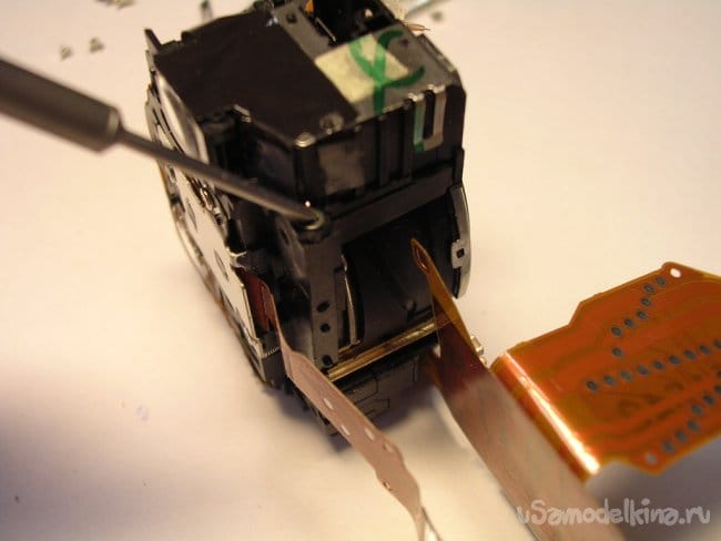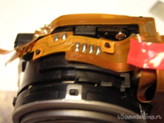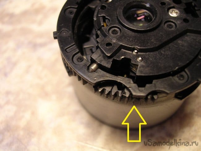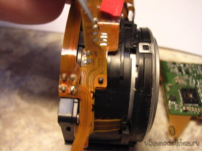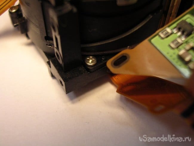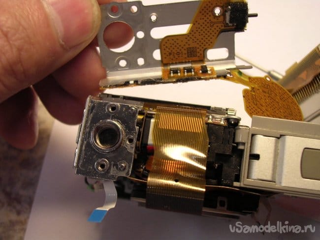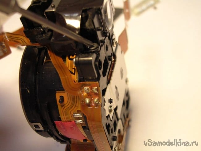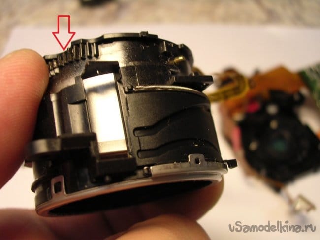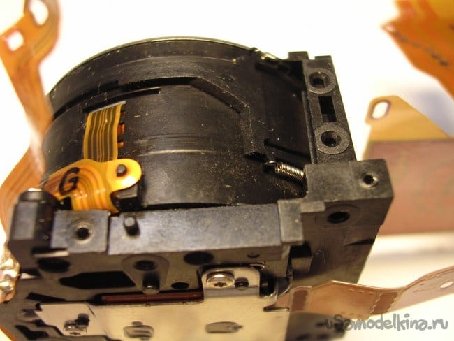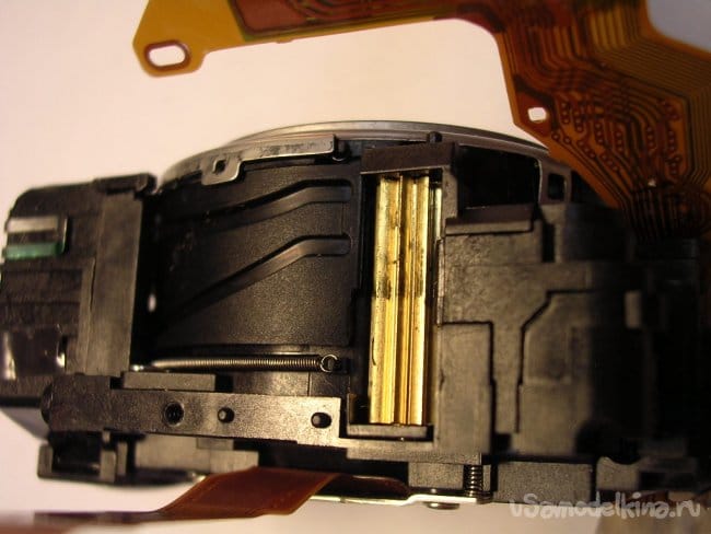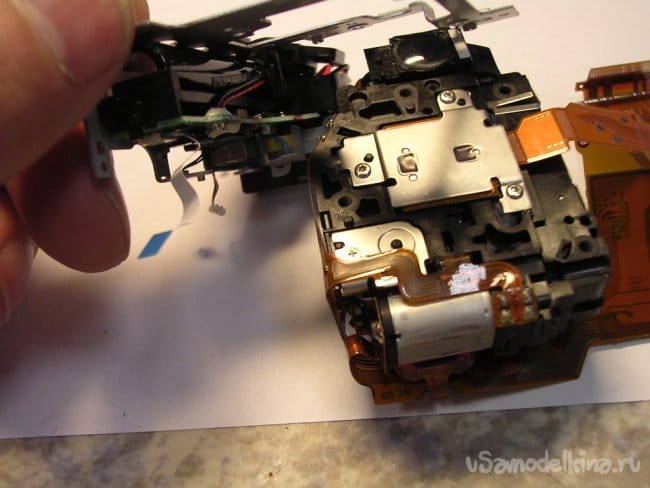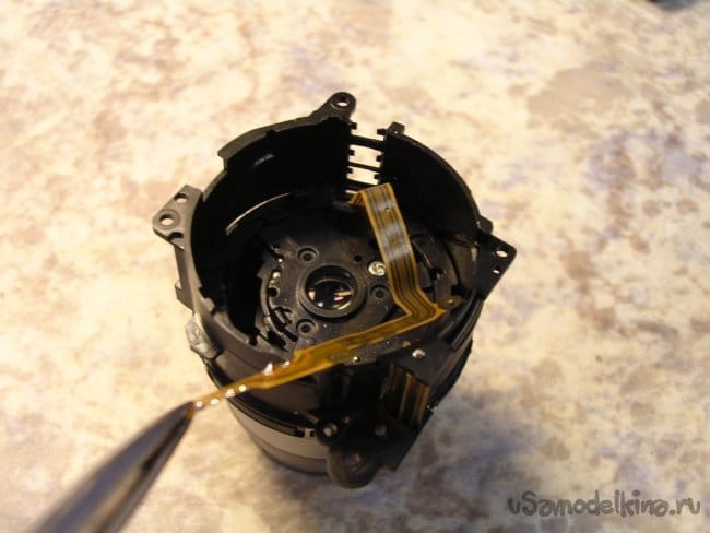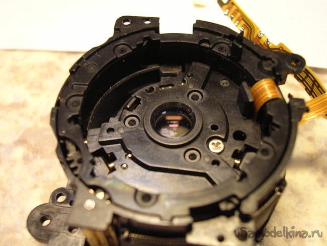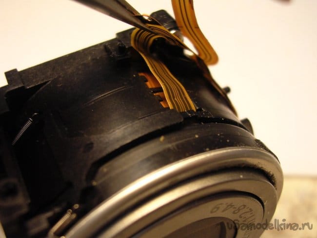 Выдвигаю объектив, нужно вынуть шлейфы управления из прорезей, чтобы извлечь поврежденный баррель и заменить.