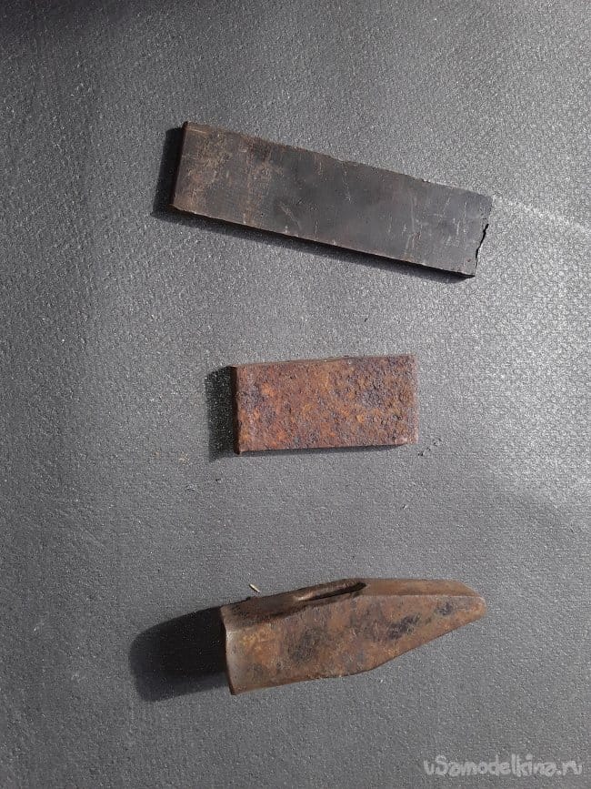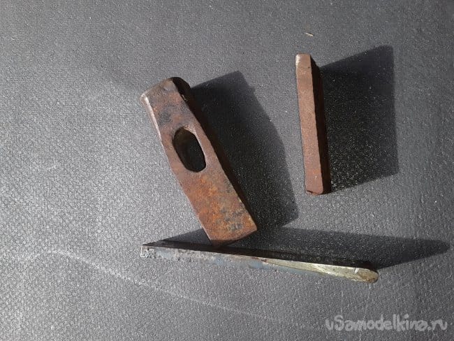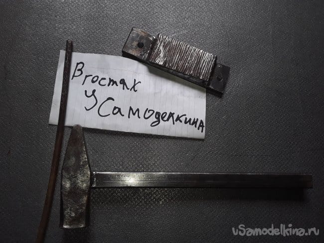Для основной рабочей поверхности нужно взять твердый металл с заводской закалкой для этих целей подходит идеально рессора так как она толстая и твердая. А молоток из 50 стали уже закален и тоже твердый так что с ним нужно работать аккуратно чтобы не перегреть иначе металл потеряет заводскую крепость и после пару ударов просто потеряет свои рабочие качества.
