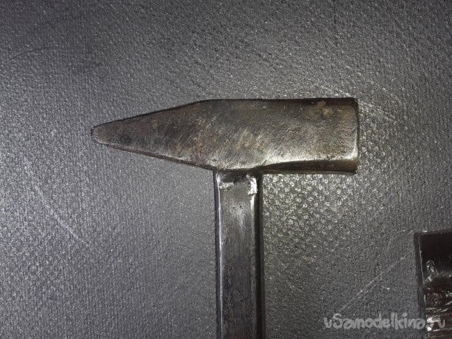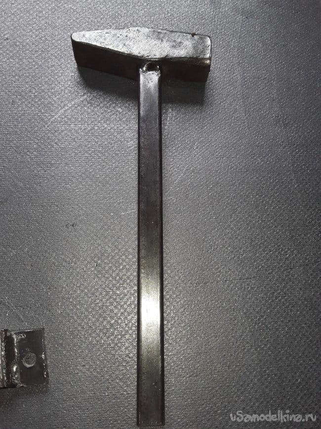 После работы с ушм все края немного заостряю напильником чтобы не было тупых углов. Ну а после так же делаю и на молотке, но между прорезами расстояние оставляю побольше и так же подравниваю напильником после работ шлифую все щеткой чтобы все выглядело аккуратно и красиво. На молоток не было подходящего деревянного черенка и пришлось приварить кусок квадрата 20 на 20 мм ну вроде все удобно. На пластине упорной просверлил два отверстия для крепления на пне. Ну вот и все готово красить решил не буду просто все зачищу и все.