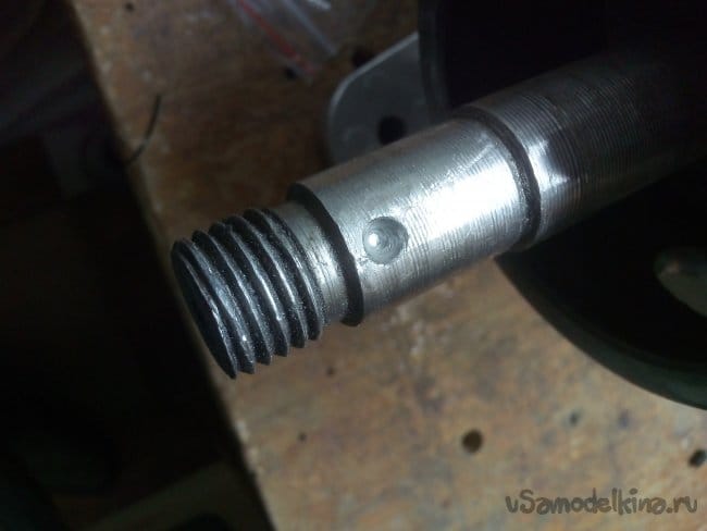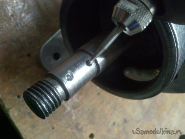 Через резьбовое отверстие насадки, сделал отметку на валу двигателя, для проточки канавки, под конус установочного винта.