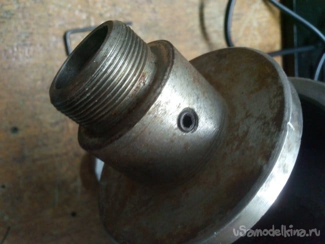 Так как для следующей операции требовалась «токарка», повез я движок в мастерские своего родного «Радио - механического техникума», в котором учился в свое время, а преподаватели - мастера остались там до сих пор. Подобрали насадку на наждачный круг с посадкой на 32 мм (точили их тогда в 90-е на продажу, а еще валы с подшипниками в моде были, для фуговальных станков, зарабатывали, как могли) и расточили в ней посадочное место на вал двигателя. Резьбовое отверстие сбоку, для монтажного винта уже было.