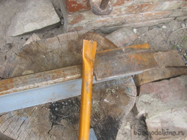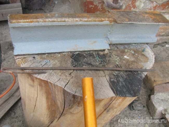 Для основы, чтобы втыкать в землю, нашел кусок толстой стальной проволоки. Один конец согнул эту часть вставляем в трубу и расклепываем потом трубу молотком. Ну а конце проволоки можно заточить.