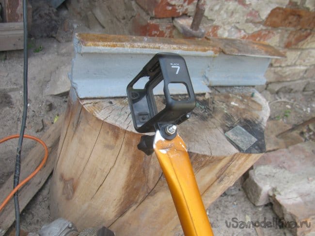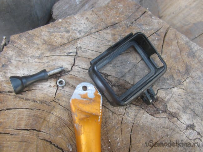 Расплющил верхнюю часть и потом обрезал лишнее, заусеницы обточил. Осталось просверлить отверстие под винт. Держатель от GoPro у меня родной. Под винт нашел гаечку. Вот и все, теперь уже камеру можно закрепить на трубе. Ее можно наклонять вверх или вниз. Гаечка там особой роли и не играет... разве что чтоб винт не потерялся.