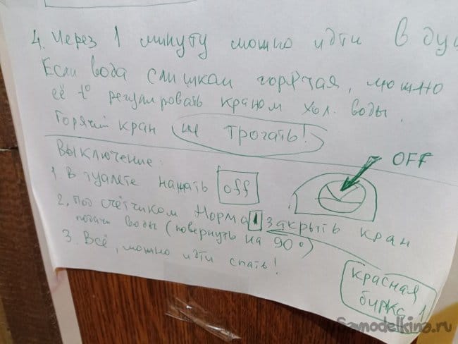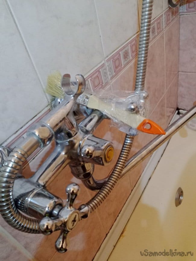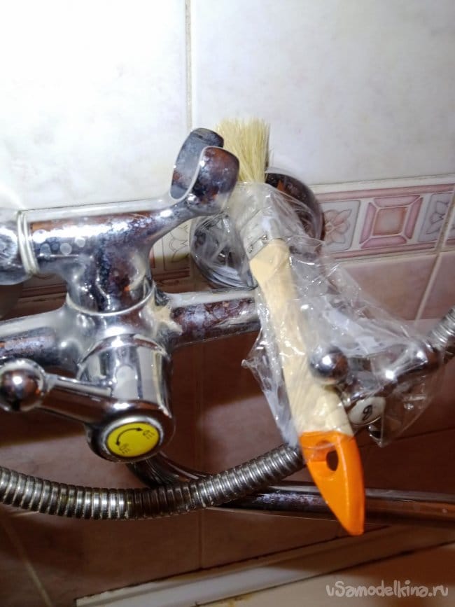 Решил я эксперимент на своих девчонках поставить, написал инструкцию, заставил их выучить, сдали мне зачёт и после этого были допущены к душу. Всё работает, но меня как инженера гложет неполная безопасность, я люблю всё делать с "защитой от дурака", чтоб уж точно не взорвалось. И мысль пришла после того, как я сам помылся и автоматически, вылезая из душа, моя рука закрыла кран горячей воды, создав предпосылку для взрыва. Рука не виновата, много лет так делала, это уже инстинкт. Побороть его я решил простецким способом: надо зафиксировать кран в ванной в положении Всегда Открыт и предотвратить любую возможность его закрыть. Порывшись в голове, как обычно, решил использовать то, что было под рукой, кисточку и скотч. Сделав нехитрую приспособу, снова несколько дней тестировал её на себе и моих домочадцах. Работает. Да, неэстетично, но работает. Цель достигнута, мы чистые, горячая вода есть всегда, всё безопасно. Малюсенькая ложка дегтя: хотелось бы напор побольше, но пару недель можно и пережить.