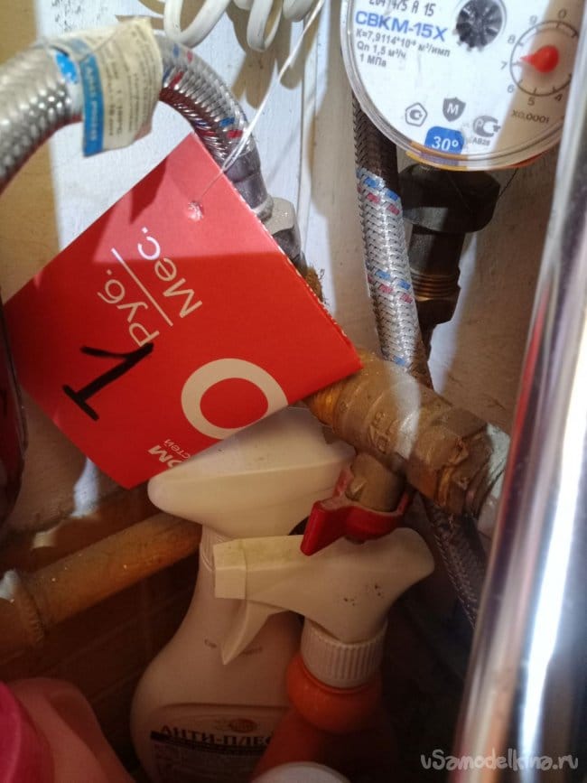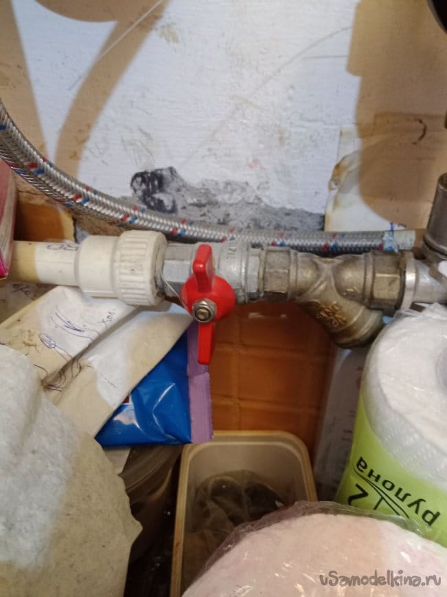 Важный момент: под нагревателем внизу первый слева красный кран бантик надо перекрыть, иначе будем нашей горячей водой делиться с соседями.