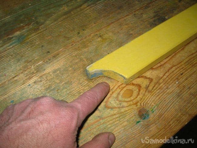 На конце этой дощечки, при помощи электролобзика с пилкой для фигурного реза, выпиливаем вот такую выкружку.