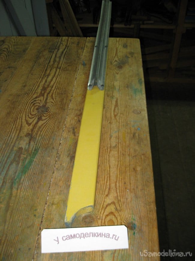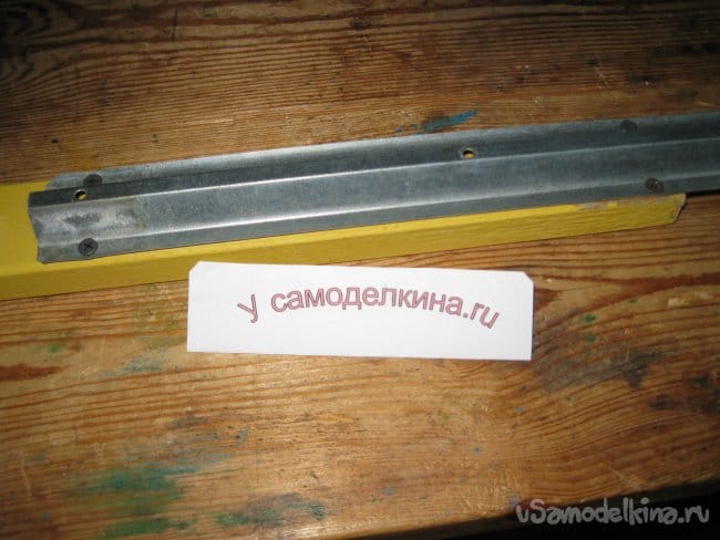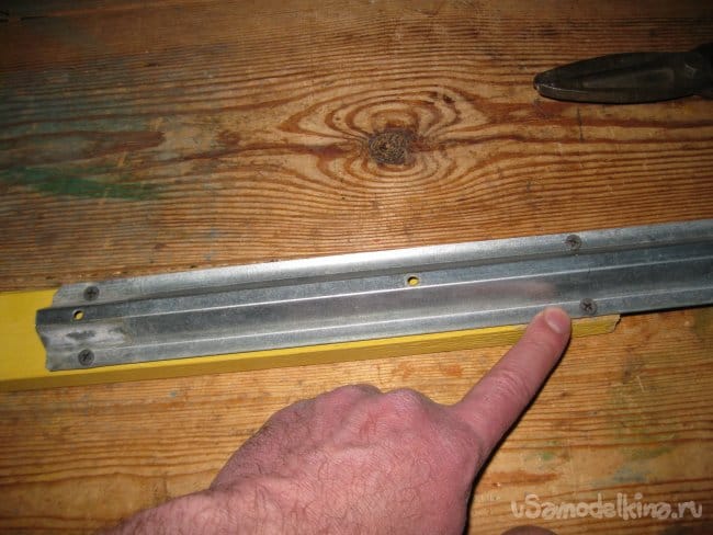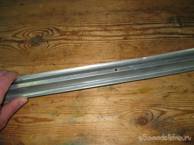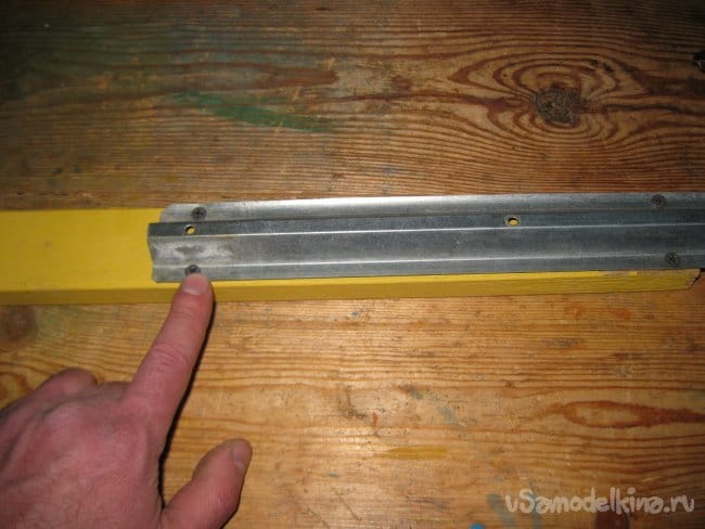Шаг 4. С противоположного конца этого профиля, сверлим четыре сквозных отверстия диаметром 4 мм, под шурупы. Одна пара отверстий на самом конце, а другая на расстоянии 30-35 см, от первой пары.