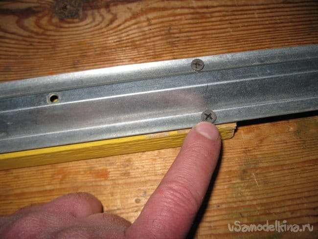 Шаг 5. Прикладываем профиль к одной из сторон нижней части дощечки и приворачиваем его к дощечке четырьмя шурупами.