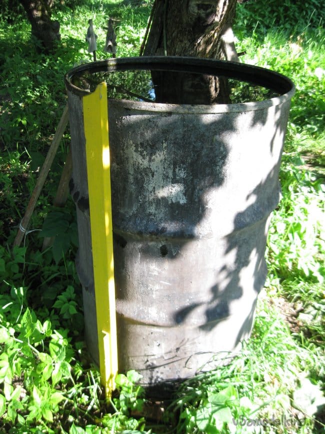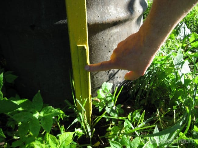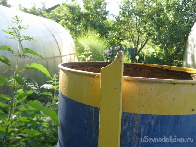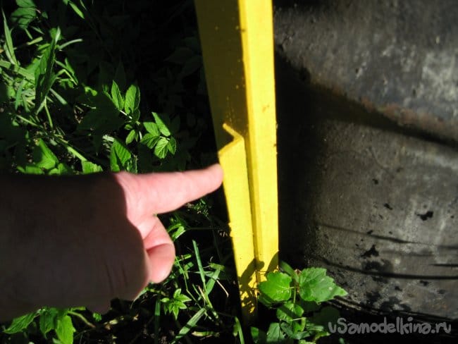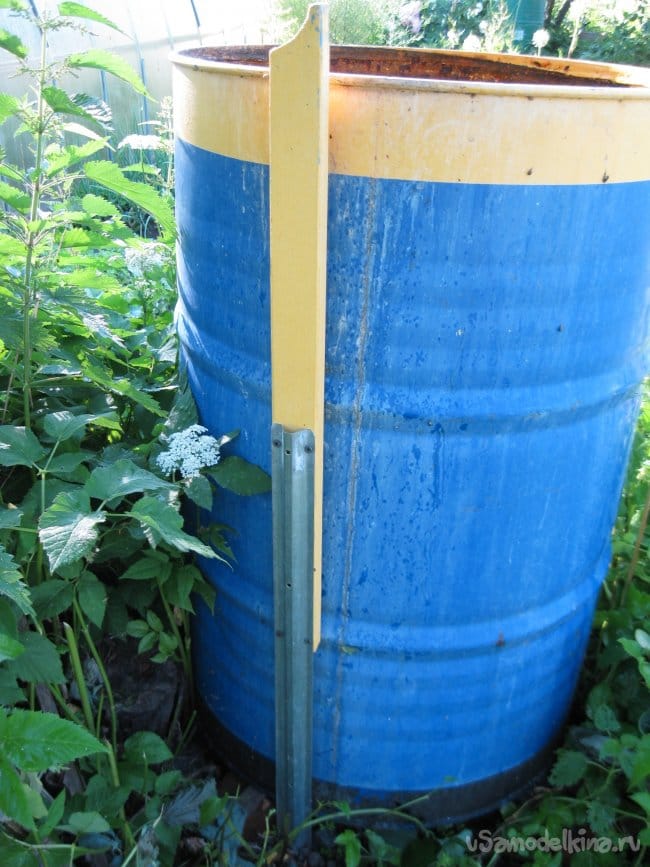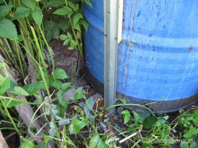 Кстати, если под рукой нет оцинкованного профиля как у меня, вместо него можно использовать обычный стальной уголок или даже достаточно толстую и прочную стальную полосу, длиной 50-60 см. Я, раньше, тоже использовал стальной уголок, но оцинкованный профиль от теплицы хорош тем, что он не ржавеет и значительно меньше весит. Да и в землю у бочки его легче втыкать.
